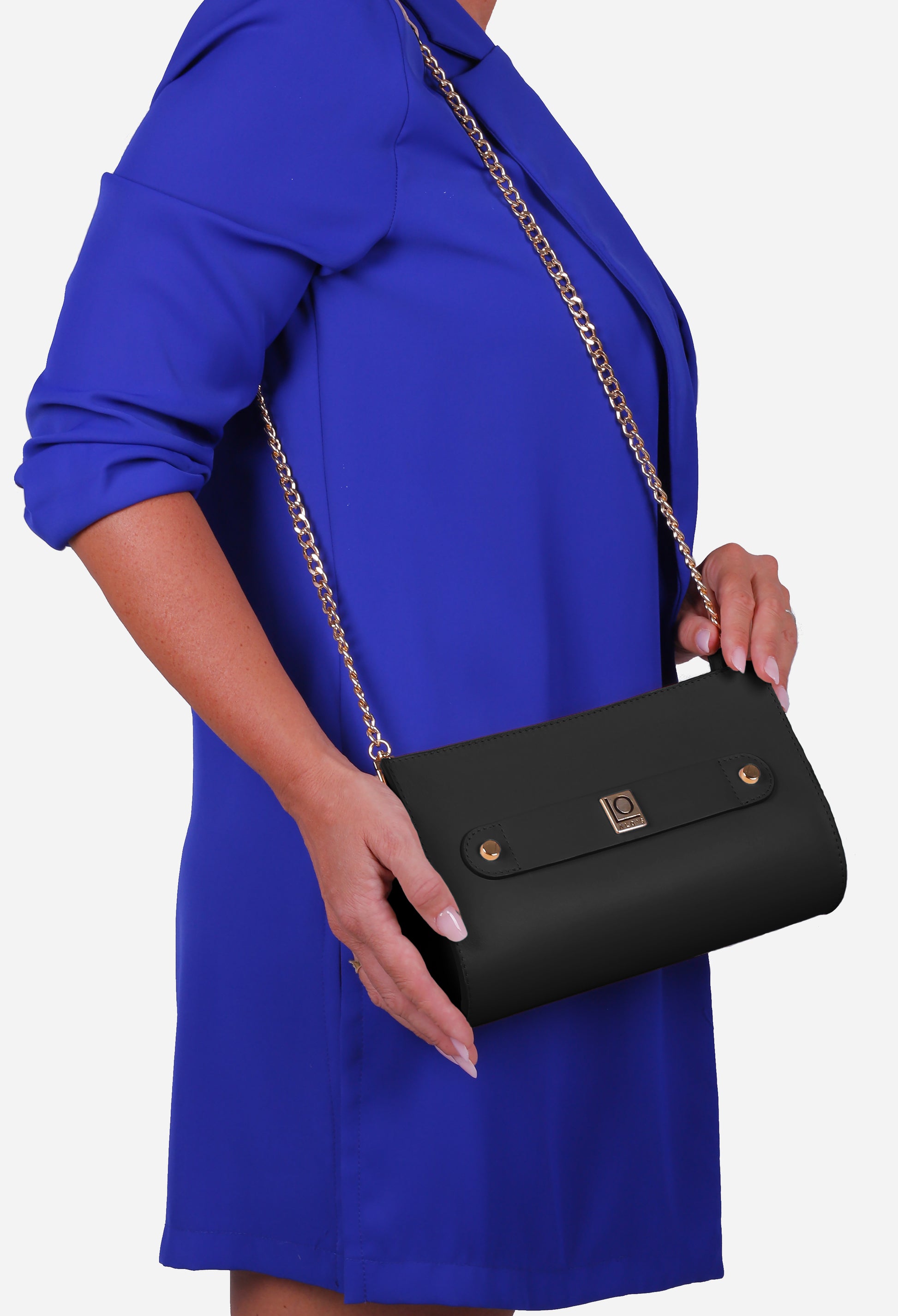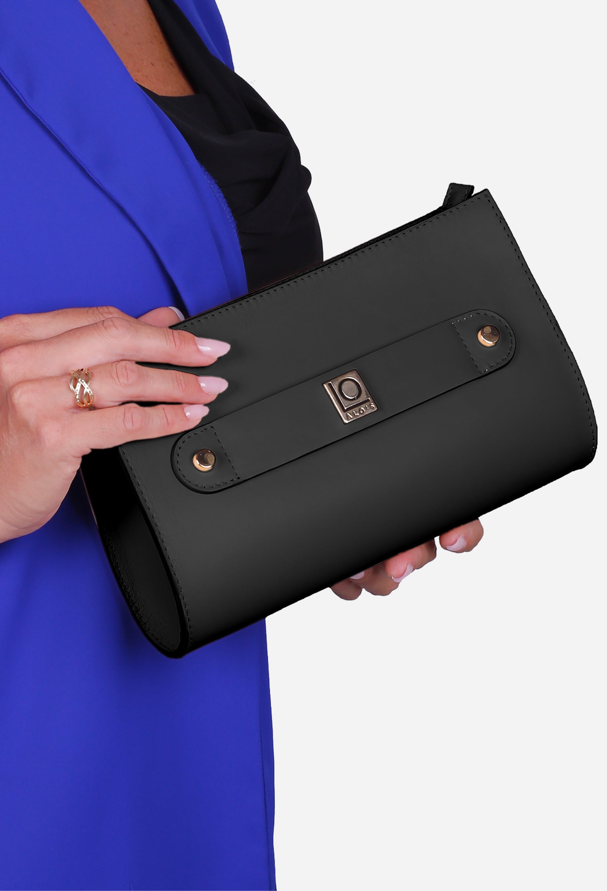 La pochette Alo' Posh in pelle color Nero è progettata per adattarsi a ogni occasione. Può essere indossata comodamente a spalla grazie alla tracolla di catena e alla rifinitura in pelle, oppure a mano, utilizzando il passante anteriore che funge da bracciale. Questo design innovativo non solo offre praticità, ma valorizza anche il tuo outfit, rendendolo perfetto per un aperitivo, una cena elegante o una cerimonia speciale.