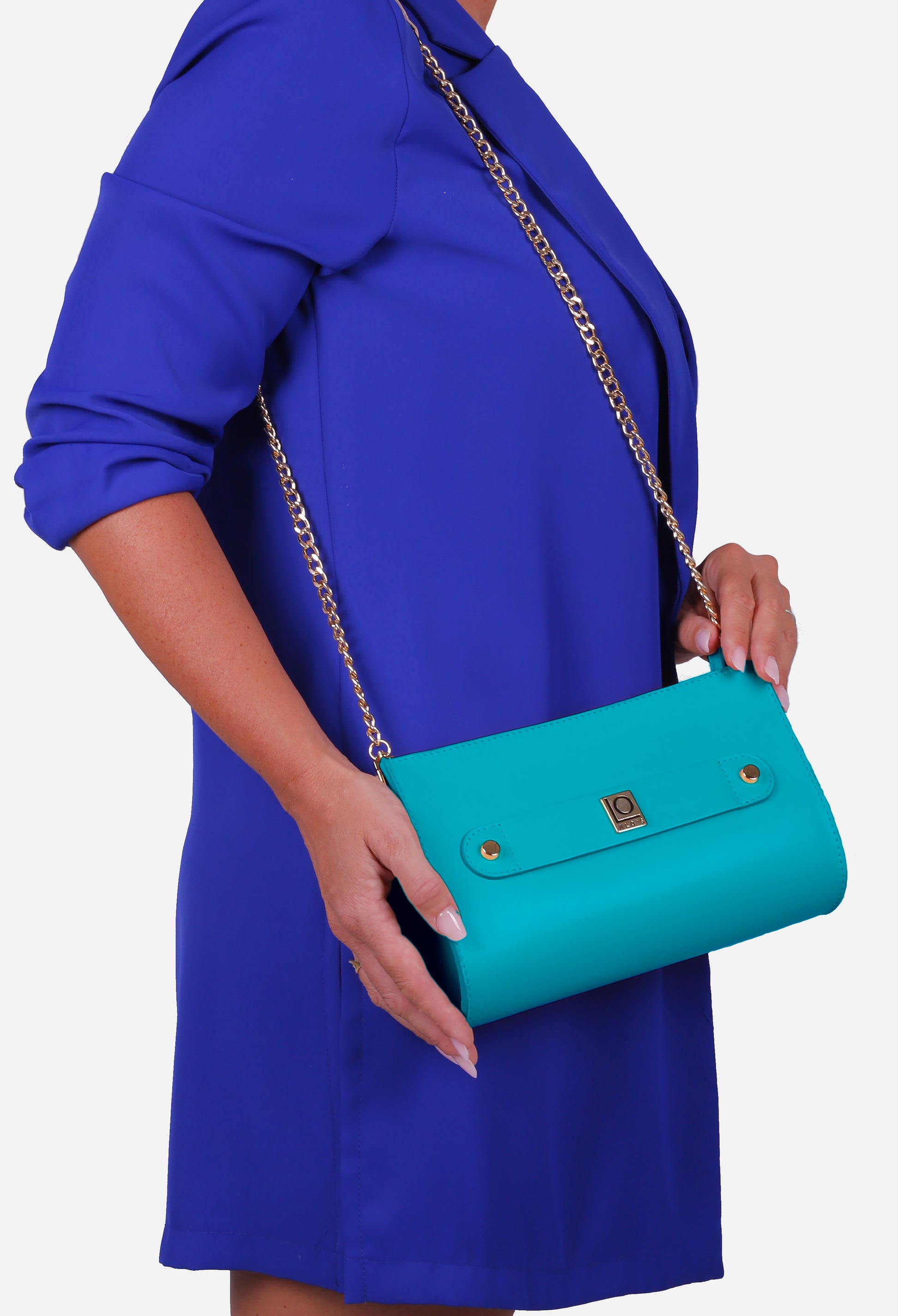 La pochette Alo' Posh in pelle color Turchese è progettata per adattarsi a ogni occasione. Può essere indossata comodamente a spalla grazie alla tracolla di catena e alla rifinitura in pelle, oppure a mano, utilizzando il passante anteriore che funge da bracciale. Questo design innovativo non solo offre praticità, ma valorizza anche il tuo outfit, rendendolo perfetto per un aperitivo, una cena elegante o una cerimonia speciale.